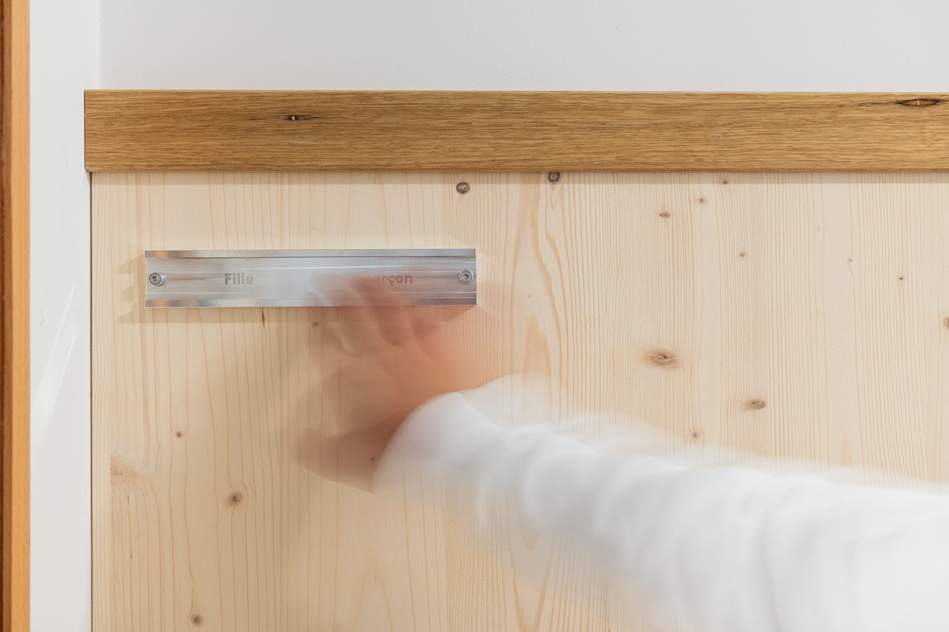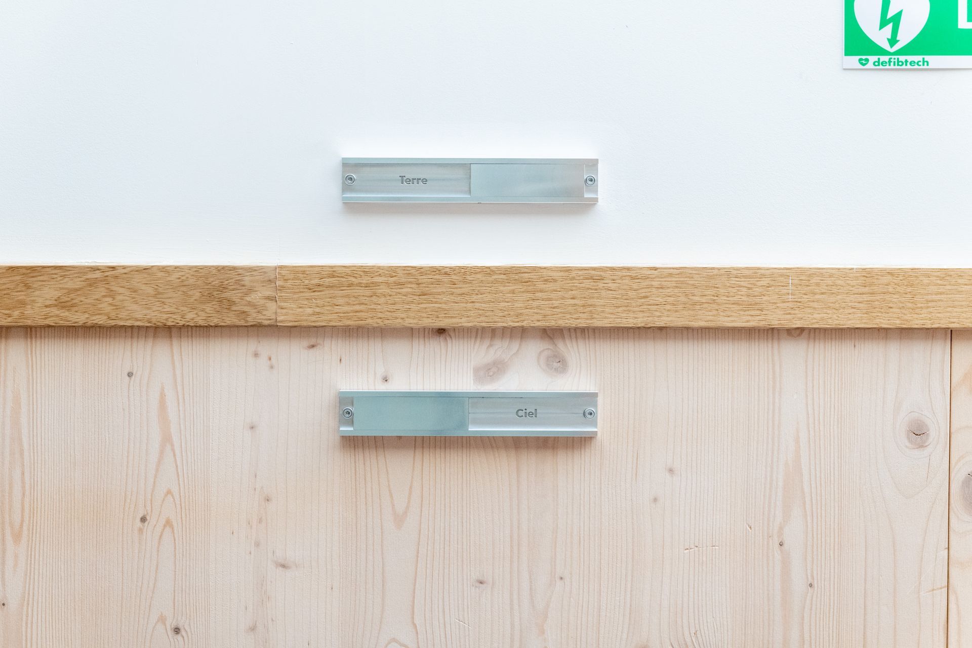 Les Deux Côtés se penche sur les frontières définies par les sociétés humaines. Au cours d’ateliers, les élèves ont identifié eux-mêmes des types de frontières politiques, sociales et philosophiques qui ont ensuite été reportées sur des plaques posées aux endroits de seuils des espaces intérieurs du collège. Chaque point de passage devient un mini poste frontière entre deux notions, à ceci-près qu’un mécanisme permet à tout moment d’en inverser le sens et d’en questionner la raison d’être.