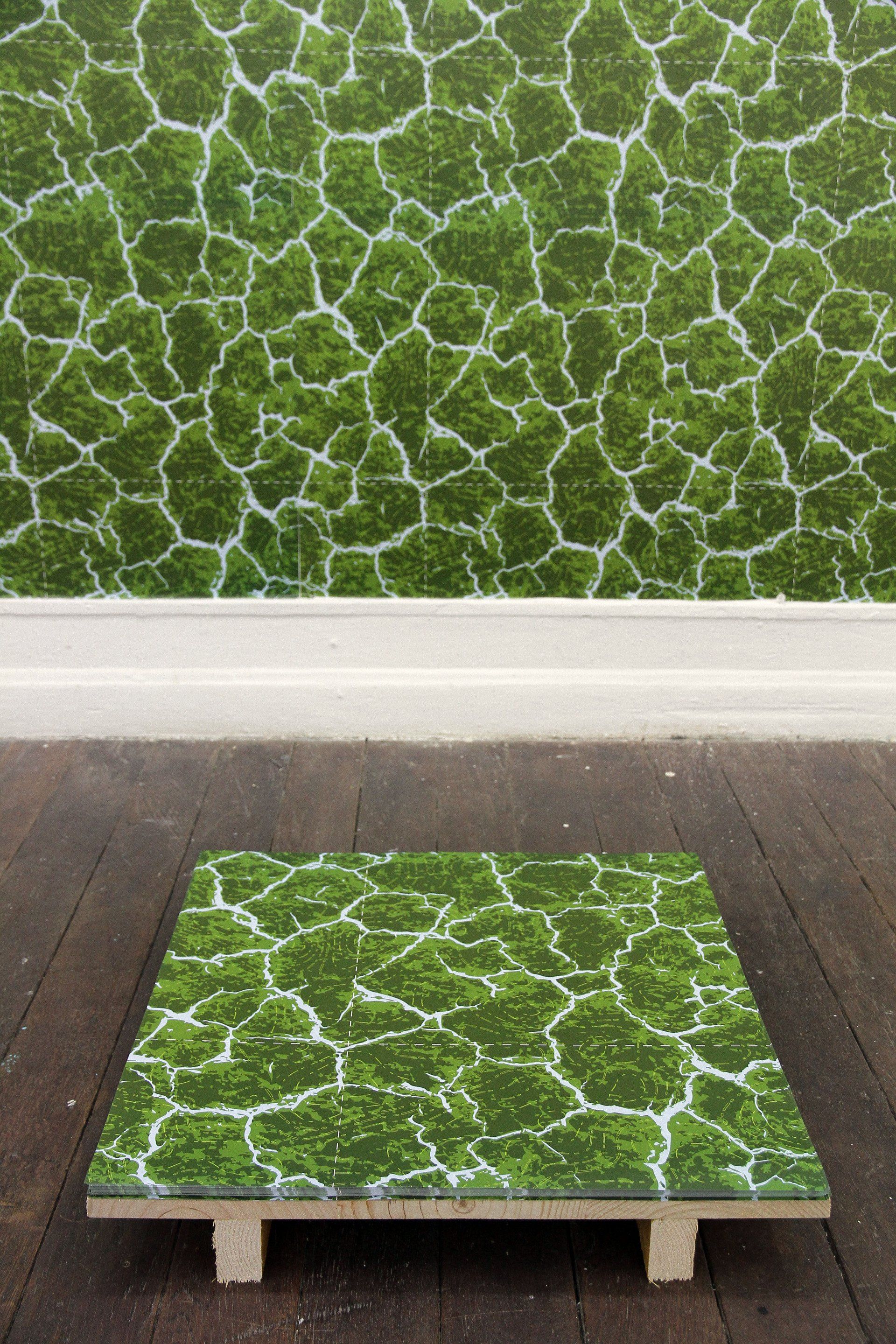 Deux papiers peints recouvrent les murs de motifs reprenant les codes de la cartographie et de la photo aérienne. Un court texte fictionnel est mis à disposition au centre de la galerie.